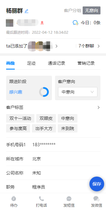 有些機(jī)構(gòu)會用上個微的標(biāo)簽對客戶進(jìn)行分類,但由于個微標(biāo)簽操作和管理都相當(dāng)?shù)姆爆嵟c不便,甚至無法與SCRM系統(tǒng)的自動化營銷功能匹配,實(shí)現(xiàn)不同階段不同客戶類型的自動營銷動作,這是相當(dāng)大的硬傷。