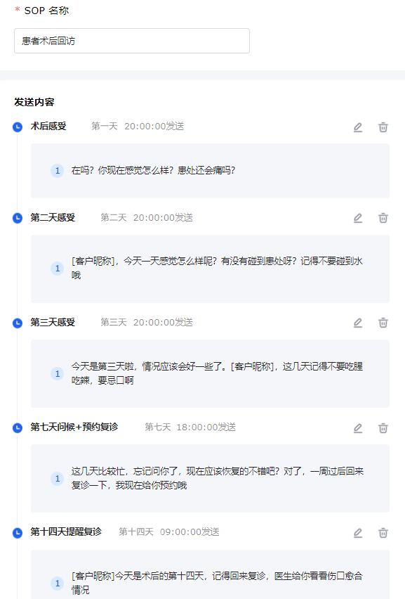 比如在合理頻率內(nèi)自動私發(fā)優(yōu)質(zhì)內(nèi)容的客戶培育SOP、根據(jù)客戶治療時間自動關(guān)懷和提醒的客戶術(shù)后回訪SOP等...